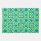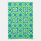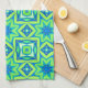 Toalla de té en un patrón de estrella abstracta geométrica en tonos de verde lima, azul cerúleo y turquesa, acentuado con azul profundo