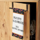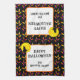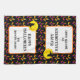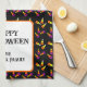 Una linda toalla de personalizado Happy Halloween con una bruja volando a través de una luna llena sobre un colorido patrón de maíz dulce en amarillo, naranja y púrpura, con letras gruesas.