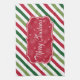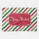 Feliz ilustracion navideño con texto y diseño de copos de nieve sobre fondo rayado rojo, blanco y verde