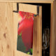 La obra de arte de esta toalla de cocina es una fotografía original de ZoeSPEAK de una flor de hibisco rojo. En la foto, el centro de la flor es golpeado por la luz del sol muy brillante mirando a través de una abertura entre las hojas verdes amarillas del arbusto. El estambre amarillo está rodeado por los pétalos rojos de la flor, que parecen amarillos, donde el sol es más brillante. El resto de la flor cae a la sombra en un color rojo profundo contra las hojas de oliva verde.