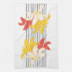 Flores naranjas, amarillas y blancas contrastadas con un fondo de rayas negras y blancas. Toalla de té de la cocina. Busque productos de coordinación en la colección de Fiestas Lily Garden.