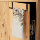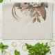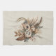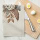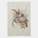 Una toalla de cocina con un ramo de flores de melocotón, rodeada de hierbas de bronce marrón y follaje con acentos de plumas. Fondo color crema marrón claro con un patrón de damasco débil.