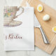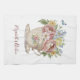 Unas hermosas flores rosadas, amarillas y azules en una toalla de cocina con taza de té. Personalízala con tu nombre o cualquier texto.