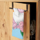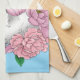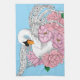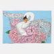 Un cisne blanco rodeado de flores rosas en un fondo azul