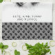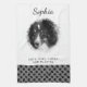 plantilla de foto mascota personalizado en color blanco y negro. Reemplace la foto del mascota de ejemplo con una fotografía de su propio mascota y personalice las áreas de texto con el nombre de su mascota y su texto personalizado. La parte inferior del diseño presenta un patrón de huellas de perros negros en color de fondo gris, mientras que la plantilla de fotos y el texto personalizado ocupan la mayor parte del área de diseño. La foto del personalizado se muestra a través de una forma redonda que le da un borde suave desigual a cualquier imagen.