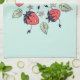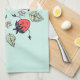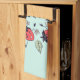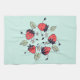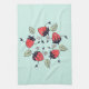 Toalla de cocina de fresas con un ilustracion vectorial que representa a 5 personajes de fresa sonrientes felices bailando en un círculo rodeado de hojas y flores de su propia especie. Diseño divertido con espíritu primaveral para una persona que ama estos deliciosos frutos.