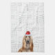 Here's a fun holiday kitchen towel or year-around hand towel. An adorable watercolor illustration of a Afghan Hound dog who sits with a fun 'woof' word art background. The dog wears a Santa hat.