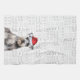 Here's a fun holiday kitchen towel or year-around hand towel. An adorable watercolor illustration of a Schnauzer dog who sits with a fun 'woof' word art background. The dog wears a Santa hat.
