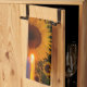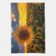 Perfeccione para el amante del girasol. Girasoles vibrantes con un resplandor solar que brilla a través de los pétalos contra los cielos tempestuosos en la puesta del sol.