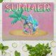 La playa de surf acuática gnome con una barba de tintes junto a una palmera y globos de Relieve metalizado de sandía sobre un fondo de grano de madera rosa y verde.