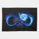 Luminous infinity symbol with glowing, beautiful, lushly blooming rose made of blue flames on black background.