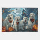 Descanse el espíritu espeluznante con este inquietante diseño de Halloween que presenta una manada de perros bajo un cielo oscuro, iluminado por la luna, rodeados de bates voladores y calabazas brillantes. Perfecto para los amantes de la diversión con sus peludos amigos.