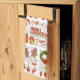 Groovy Hippie Retro Merry Christmas Santa Funny Name Personalized Kitchen Towel Tea Towel presenta coloridos íconos vintage de Navidad como Santa Claus, árboles de Navidad, gente de pan de jengibre, coronas, regalos y el texto "Feliz Navidad y feliz Año Nuevo" en la moderna tipografía de escritura roja. Perfecto para Navidades y regalos de vacaciones. Diseñado por ©Evco Holidays www.zazzle.com/store/evcoholidays
