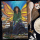 Un hada con alas naranja y amarillas sentada sobre escalones de piedra que conducen quizás al reino de los hados. La hada afroamericana no está sola, está con su perro guardián doberman este día de otoño.