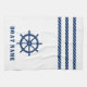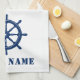 Personalizado Náutica Barcos Helmín y franjas con tu nombre de barco personalizado en azul marino profundo sobre una toalla de cocina blanca.