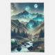 Un hermoso ilustracion de campamento aéreo de una tienda de campaña instalada junto a arroyo con un fondo montañoso y las luces boreales y luna llena en el cielo.