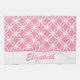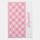 Una bonita toalla de cocina rosa, este elemento tiene como fondo un patrón circular rosa y blanco. Hay un lugar donde personalizar tu nombre. Fondo: Huckleberry Hearts, LLC, © www.Huckleberry-Hearts.com