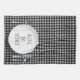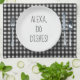 Aparato electrónico Alexa para lavar platos en placa blanca de cena con un patrón de gingham en blanco y negro.
