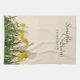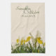 Un teatowel con una foto del bucharica amarillo y blanco del iris con verde se va en un fondo poner crema, con las plantillas del texto para completar de la novia y prepara nombres y la fecha del acontecimiento, para un regalo nupcial de la ducha, del boda o del aniversario. Los efectos de escritorio a juego del boda con iguales diseñan disponible.