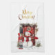 Soldado británico de juguete en un gorra de piel de barbacoa con un muñeco de nieve alegre y un saludo de Feliz Navidad con texto de oro