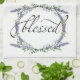 Un diseño romántico y elegante con la palabra "bendecido" enmarcada por eucalipto y lavanda pintada en acuarela.