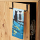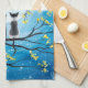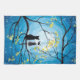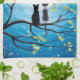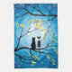 Dos gatos sentados en una rama mirando la luna llena con un cielo azul lleno de estrellas. Las ramas de los árboles que los rodean con flores amarillas pequeñas. Gato de esmoquin negro y gato manchado de dos colores blanco y gris. Pintura acrílica original moderna y caprichosa de Donna Leger. Todos Los Derechos Reservados. ©diseños de ironía