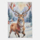 Reno festivo con brillantes antarismas y un arco rojo, en un pueblo nevado rodeado de pinos, perfecto para añadir calidez y encanto a las vacaciones.