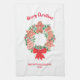 Esta divertida y festiva toalla de cocina está decorada con una acuarela de una corona festiva de galletas de Navidades.