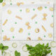 El diseño de Pasta & Polka Dots incluye ilustracion acuático de deliciosas variedades de pasta, como Farfalle, Fusilli, Orecchiette, Conchiglie y Penne con adorables puntos de polka verde.