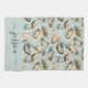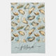 Modern oysters pattern script name on beige kitchen towel. Personalize name.