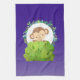 Una toalla de cocina con un ilustracion personalizado de un mono que asoma por detrás de un arbusto verde. Rodeado por una corona de hojas tropicales. Se establece en un fondo de degradado púrpura.