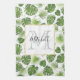 Una toalla de cocina con un patrón de bonito de hojas tropicales verdes. Diseño exótico y elegante. Un cuadrado blanco con un falso borde de Relieve metalizado dorado sobre la parte superior con tu texto dentro.