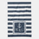 Toalla de cocina con monograma de iniciales personalizadas elegante con ancla y patrón de franjas azules y blancas con las iniciales de su monograma en un cuadrado con borde azul marino. Diseñado por Thisisnotme©