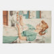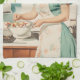 Un ilustracion de estilo retro de una mujer con un vestido verde azulado y un delantal floral, preparando huevos de Pascua en una acogedora cocina. La escena desprende una estética nostálgica de los años 50, con tonos pastel y utensilios de cocina detallados.