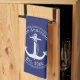 Esta toalla de cocina azul y blanca de inspiración náutica le dará un toque de encanto a su decoración. Este diseño presenta un elegante ancla con una cuerda detallada entrelazada con un borde circular de cuerda sobre blanco sobre un fondo azul marino. El nombre de su familia y el año establecido se encuentran en una tipografía circular que usted puede personalizar. Ideal para casas de verano y casas de playa.