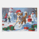 Un ilustracion vacacional reconfortante con un perro alegre jugando en la nieve, usando un sombrero de Santa y rodeado de coloridas cajas de regalos. En el fondo, los niños construyen un muñeco de nieve al lado de un árbol de Navidad cubierto de nieve, creando un alegre maravilloso país invernal. Perfecto para difundir alegría por las vacaciones y capturar la magia de los Navidades.