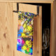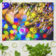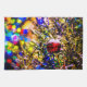 Árbol de Navidad y bola de ornamento rojo cubierta de nieve fresca. Luz colorida alrededor. Humor alegre y alegre. Feliz Navidad Y Feliz Año Nuevo. Saludos de temporada. Impresiones y regalos para cualquiera por diversión y buen humor. Productos y souvenirs horizontales o orientados al paisaje.