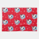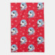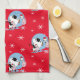 Vacas blancas y negras vestidas con sombreros de Santa sobre un fondo rojo con toalla de cocina de copas de nieve.