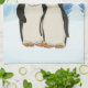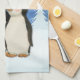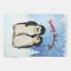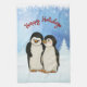 Adorable pareja de pingüinos en un terreno cubierto de nieve con bosque de pinos y cielo azul en el fondo. La tipografía de arte de texto de arriba dice Felices Fiestas. Personalizar de área de texto abajo o borrar si no se desea.