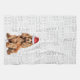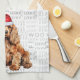 Aquí hay una divertida toalla de cocina o toalla de mano todo el año. Un adorable ilustracion acuarela de un perro Cocker español sentado con un divertido fondo artístico de palabra "woof". El perro lleva un sombrero de Santa.