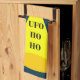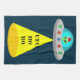 Esta impresionante toalla de cocina para Navidades presenta una imagen de arte digital de una nave espacial alienígena decorada con luces de Navidades de colores brillantes. Dentro del OVNI que mira por la ventana hay un extraterrestre verde con los ojos negros usando un sombrero festivo de Santa. Hay un cono de luz que viene del platillo volador. La sombra de un mensaje está siendo proyectada a la Tierra. El mensaje dice Ho UFO. Saludos de vacaciones desde el espacio exterior para todos los terrícolas.