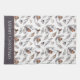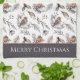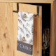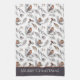 Aquí hay una toalla de cocina de bonito para usar durante la temporada navideña. El patrón incluye pequeños pájaros de invierno en tonos rojos y azules grises, hojas y bayas huecas, y se coloca sobre un fondo blanco. En un extremo hay un borde gris coincidente con el texto de su personalizado en blanco. ¡Elegante y festivo!