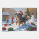 Un ilustracion vacacional reconfortante con un perro alegre jugando en la nieve, usando un sombrero de Santa y rodeado de coloridas cajas de regalos. En el fondo, los niños construyen un muñeco de nieve al lado de un árbol de Navidad cubierto de nieve, creando un alegre maravilloso país invernal. Perfecto para difundir alegría por las vacaciones y capturar la magia de los Navidades.