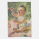 Ilustración antigua de niños y bebés que presenta a una adorable niña sentada en una manta rosa estirando los brazos hacia su madre.