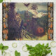 Toalla de cocina de Halloween que muestra a una bruja volando a través de un cielo estrellado por la noche sobre campos con calabazas, un gato negro y un búho. La bruja está resumida en las estrellas. Esto es de un antiguo diseño de Halloween de 1913.