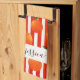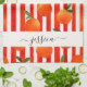 Toalla de cocina moderna con un patrón de frutas naranjas a rayas blancas rojas y un nombre de escritura femenina con letras a mano. Personaliza con tu nombre.