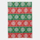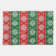 Scandinavian-inspired faux-knit pattern of snowflakes, diamonds, and festive stripes in red, green, white, and gold.