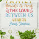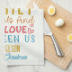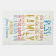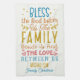 Esta toalla de cocina muestra la oración que tantas familias han abrazado a lo largo de los años. "BENDIGA la comida que tenemos ante nosotros, la FAMILIA a nuestro lado y el AMOR entre nosotros". Añade tu propio apellido, y el evento (Navidades, Acción de Gracias, Reunión, Pascua, etc.) en la parte inferior. Los colores utilizados son azul cielo, marrón naranja, oro y rojo.