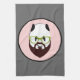 Un oso panda blanco y negro con gafas verdes. El panda tiene barba marrón y bigote. El fondo es un círculo rosa. Un diseño divertido, divertido, humorístico y hipster.