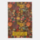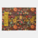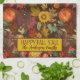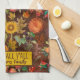 Toalla de cocina botánica personalizada otoño con girasoles, hojas de berry, follaje y patrones de caída de bonito. Feliz otoño u otro saludo personalizado y apellido o nombre de la persona.